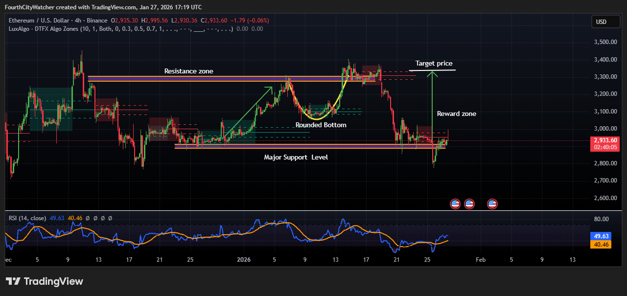 以太坊价格发出看涨反转信号,接近 2,850 美元支撑位
