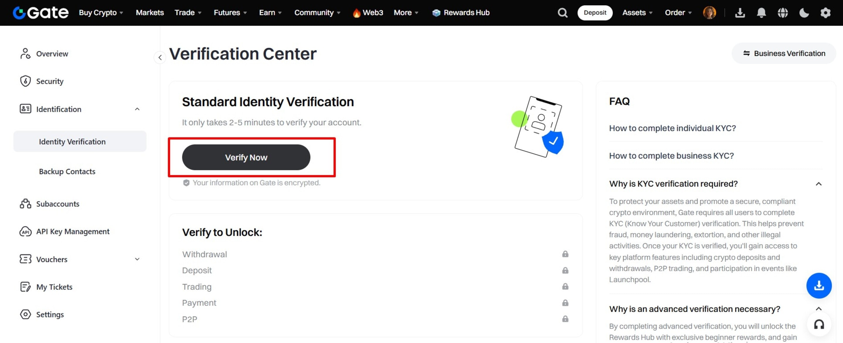 1. Verify and Claim 15 USDT: Upon submission, you will gain instant access to the Gate.io dashboard. Click on “Verify now to claim 15 USDT.” You will be taken to the verification center, where you can submit your documents for full access to account features, including deposits, withdrawals, and higher withdrawal limits.