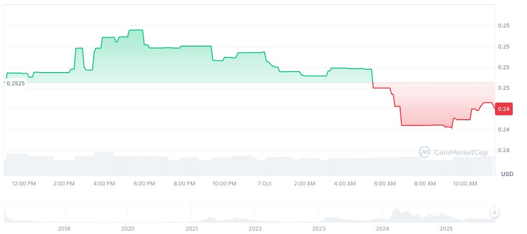 CoinMarketCap 的数据显示,尽管市场波动较大,但 SingularityNET (AGIX) 目前的价格为 0.25 美元。在过去 24 小时内,AGIX 下跌了 1.36%,尽管过去一周上涨了 1.63%。这是因为人工智能的叙述势头强劲,但与马斯克或 xAI 的活动缺乏实质性联系。