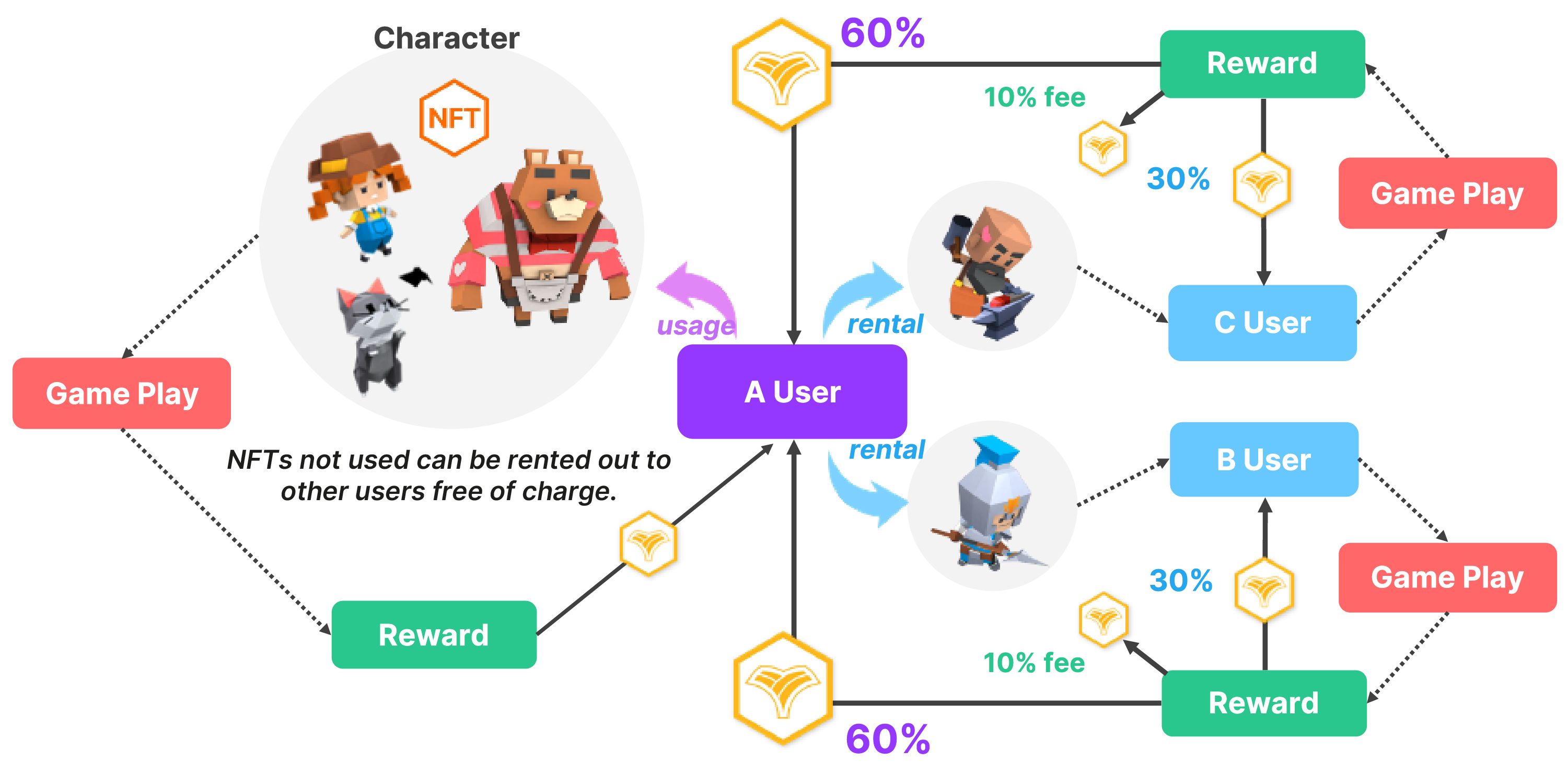 - 为了降低门槛并欢迎更多早期玩家,游戏构建了自己的 NFT 借贷系统。因此,用户可以将自己的角色或土地借给他人,以换取更多 YAC 和 FANT 代币形式的奖励。