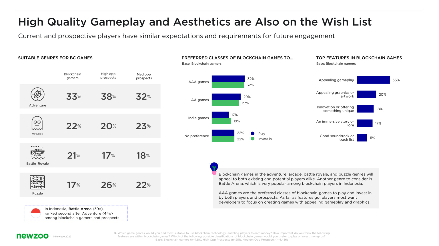- Newzoo 认为,帮助大规模采用的最佳策略之一是创建“恰好以区块链为特色的高质量游戏”(边玩边赚钱,而不是边玩边赚钱)。