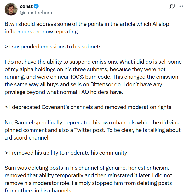 Covenant AI 声称子网排放被暂停,Bittensor 创始人否认指控