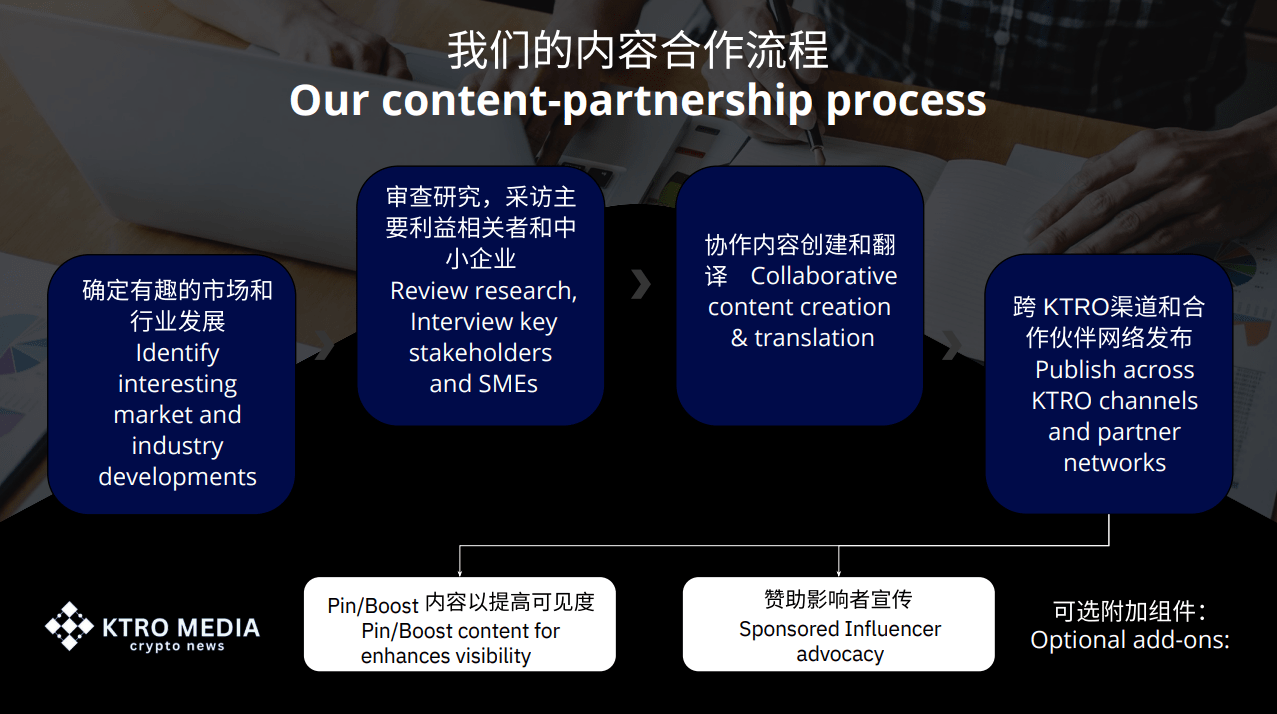 KTRO MEDIA 致力于支持和推广 Web3 生态系统的发展。我们相信,合作是构建区块链和金融科技可持续和包容性未来的关键。因此,我们向所有 Web3 项目伸出携手之邀,希望与您合作,将您的项目展示在我们的平台上,帮助您扩大知名度和曝光度。